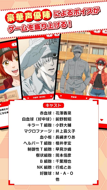 Hanazawa Kana(紅細胞)Maeno Tomoaki(白細胞(中性粒細胞))長繩瑪利亞(血小板)井上喜久子(巨噬細胞和單核細胞)大輔大輔(殺手T細胞)