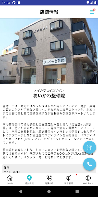 おいかわ整骨院の公式アプリが登場。アプリを通して『おいかわ整骨院』の新着情報やお得な情報をリアルタイムで受け取ることができます。また、いつでもお手元のスマートフォンから、メニューやご希望のお時間帯のチェック・ご予約などが可能です。アプリをインストールしていただくことにより『おいかわ整骨院』を、より便利に身近にご利用していただけます。