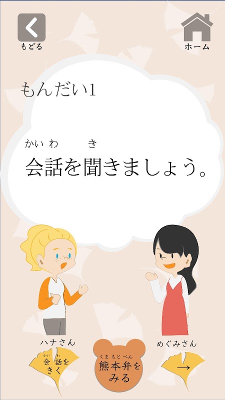 単語自体が標準語と異なる「ことば」,文法体系が全く異なる(語形変化や助詞,敬語な ど)「ぶんぽう」, 音変化が起こる「はつおん」の3つの項目に分けた熊本方言の聞き取り学習をすることができます。 熊本方言の聞き取り学習は,熊本県への転入者の方が日常生活で接する熊本方言話者と話 すことを想定した会話音声を聞き,会話中に出てきた熊本方言の意味や会話につながる言葉をクイズ形式で3択から解答を選択して正誤判定をするという流れで進みます。 「会話をきく」「問題をきく」を押すと,音声が流れます。 「熊本弁をみる」「問題をみる」を押すと吹き出しに音声の文字が表示されます。「標準語をみる」を押すと,吹き出しに会話を標準語化したものと答えが表示されます。