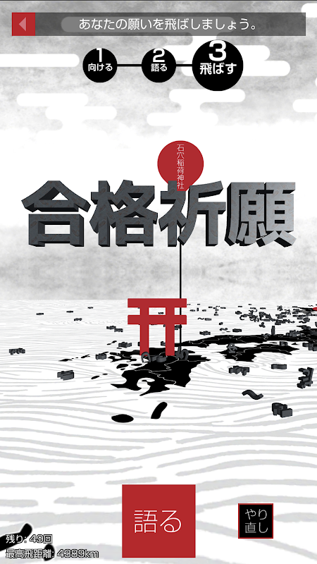 スマホに向かって唱えた願いが、3D の「ひとことだま」に変換されたら、 石穴神社の方向に向かって、フリック!