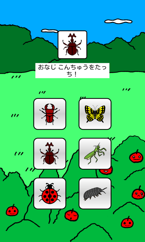 画面の上部にランダムで表示される昆虫(こんちゅう)の絵と同じ絵のボタンをタッチします。