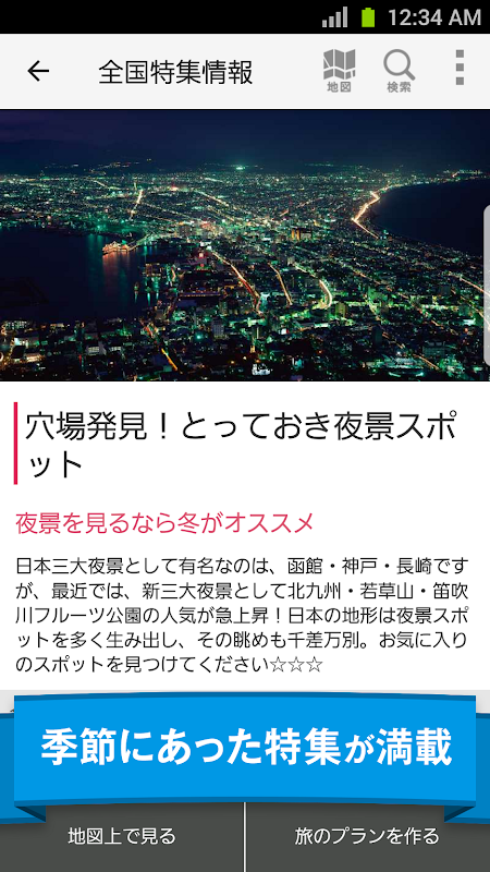 全国約30,000件の「観光スポット」や約1,300本の「おすすめの旅」、そして約4,000種類の「ご当地グルメ」があなたのスマホの中に!