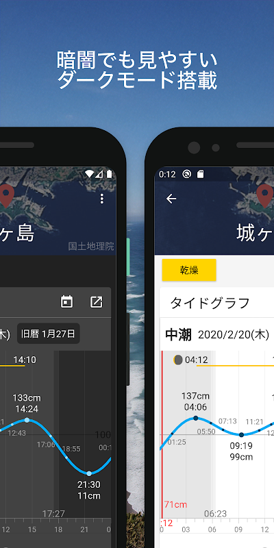 潮汐圖可讓您水平滾動並看到過去和未來永遠流動。一個優秀的工具,可以讓您同時檢查潮汐名稱、月出和月落。滾動時,您還可以以詳細的時間單位查看潮位。它還具有放大功能,可以在一個螢幕上僅顯示潮汐圖。