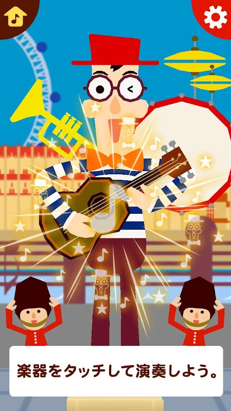 しまじろうと音楽大好き「ブラボーさん」と一緒に、いろいろな楽器を演奏しよう!リズムに合わせて画面をタッチするだけで、おなじみの曲にオリジナルのアレンジを加えることができます。