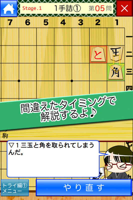 また、将棋では最後に玉を詰ますゲームです。このアプリではその「詰み」とはなんなのかというところを主眼におき、簡単な1手や3手の詰将棋を解くことが中心となっています。