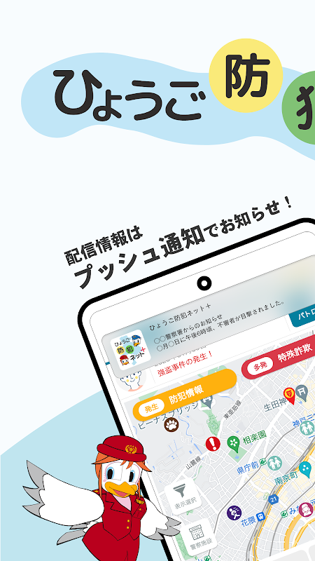 兵庫犯罪預防網絡+(Plus)提供縣內犯罪發生資訊、可疑人員資訊、特殊詐騙相關資訊、交通事故資訊等,並提供預防犯罪蜂鳴器功能等對安全、安保有用的便利功能。