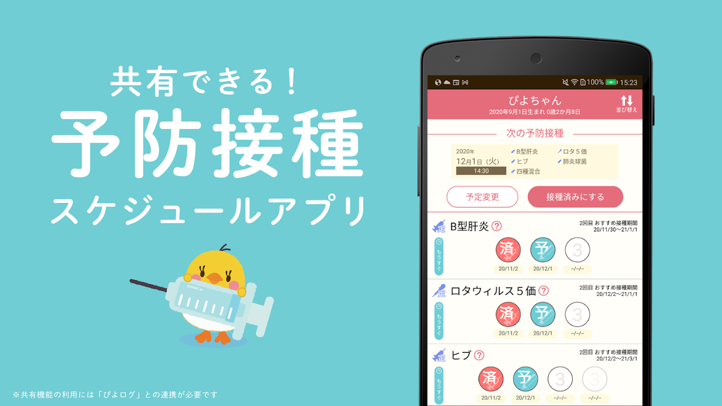 從出生後兩個月開始接種疫苗,類型和時間很多,而且設置很困難!它是一款應用程序,可輕鬆查看和管理您正在註入的內容以及剩餘的內容。通過鏈接保育記錄“ Piyolog”,您可以與情侶共享時間表,並在保育記錄側反映疫苗接種記錄。