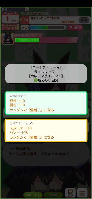 在遊戲屏幕上疊加 Uma Musume Pretty Derby 事件選項的效果。