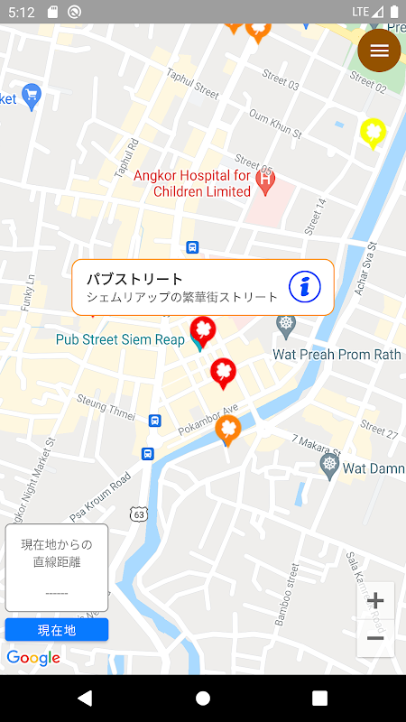 地図上に自分の現在地を表示させることもでき、各場所をタップすると現在地からの距離が計測されます。(ただし直線距離なので、実際の移動する道の距離や大変さとは異なる場合がございます。)