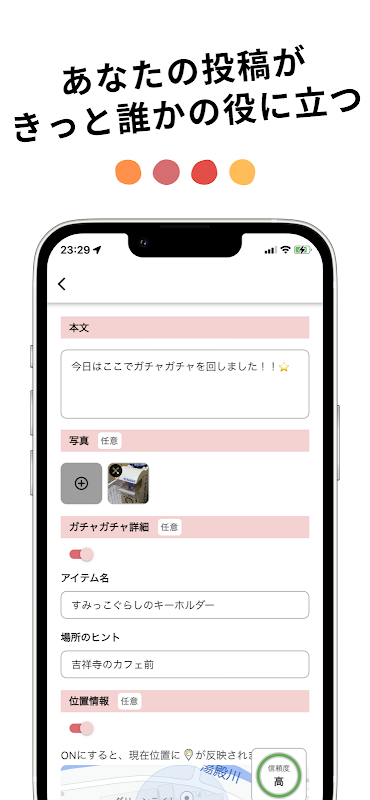 這是一個專門用於Gacha Gacha / Capsule玩具的SNS應用程序。根據每個人發布的位置信息,將創建一張Gacha Gacha地圖。