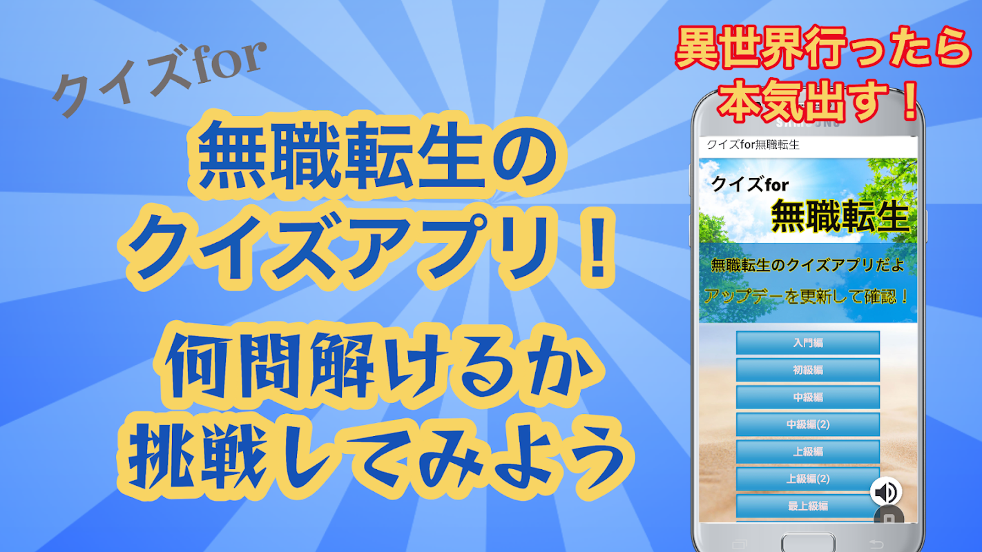 它是一個由流行作品的粉絲和失業轉世者的非官方問答應用程序。將從漫畫和動漫中提出問題。這是一個免費的問答遊戲應用程序,帶有四道選擇題,請玩甚至消磨時間。