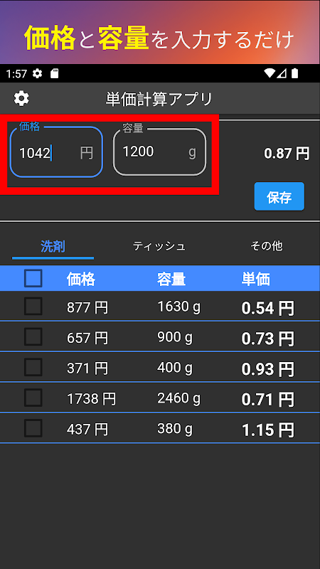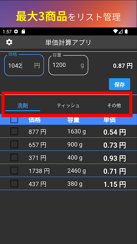 您可以為每個產品(最多 3 種)創建一個單價比較列表。只需輸入價格和容量。