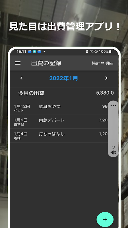 它看起來像一個可以實際使用的簡單費用管理應用程序(袖珍本),因此您可以真正使用它,即使您嘗試安裝它但它不是很好用,它看起來也不會不自然。如果您在費用註冊屏幕上輸入密碼,將顯示保存秘密照片和視頻的文件夾。