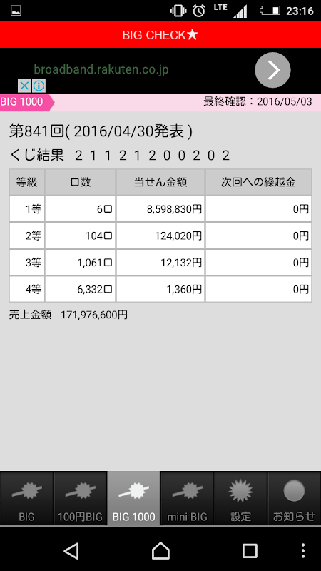 BIG CHECK★は、スポーツくじ・サッカーくじ(BIG、100円BIG、BIG1000、mini BIG)の当せん確認を簡単に行う無料のアプリです。対象となるサッカー(Jリーグ)の試合結果が確定すると、試合結果と当選口数、当選金額、次回への繰り越し金額を速報としてお知らせします。