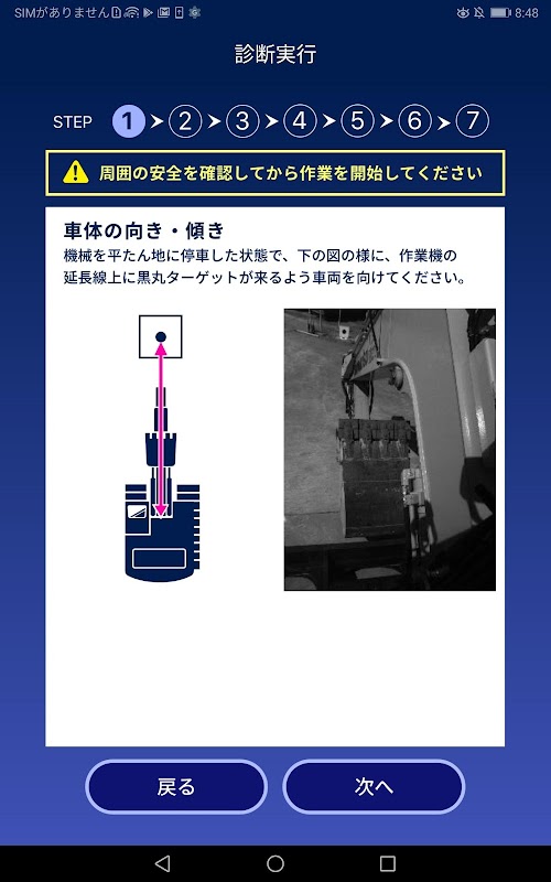 ⑤按照屏幕上的說明進行操作,並調整車輛的方向/傾斜,到目標的距離以及動臂角度。