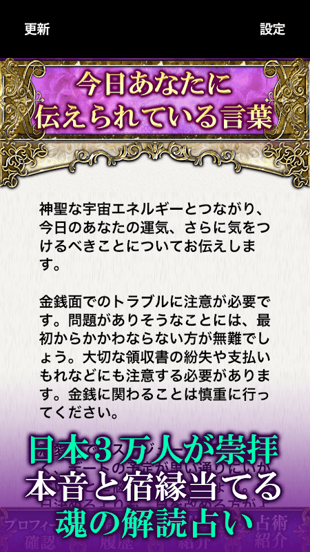 ※一度ご購入された占いも、「違った端末でアプリを再インストールした場合」や、「一度アプリをアンインストールしてから再度インストールし直した場合」には再購入が必要です。こちらご承知下さいませ。