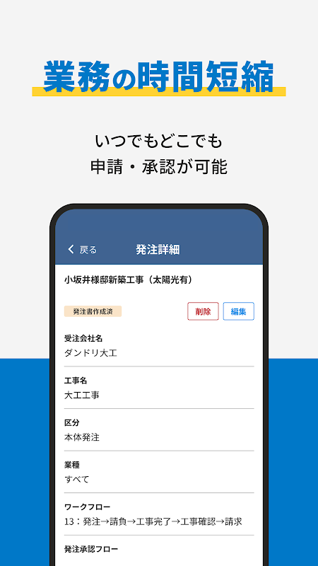 「Dandori Order -訂購應用程式-」是透過與「Dandori Work -現場管理應用程式-」中創建的資訊連結來執行建築工地訂購工作的專用應用程式。您可以視覺化訂購流程,快速回應行動訂購任務,並透過無紙化降低成本。
