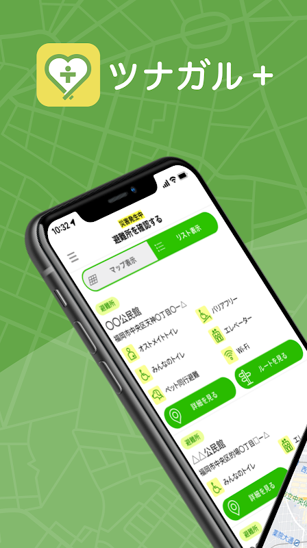 除了在發生災難時在地圖上顯示附近避難所列表之外,這是一款智能手機應用程序,可讓您在避難所內共享信息。這是福岡市和 Tsunagaru 應用程序,例如獲取有關避難所和救援物資的信息。