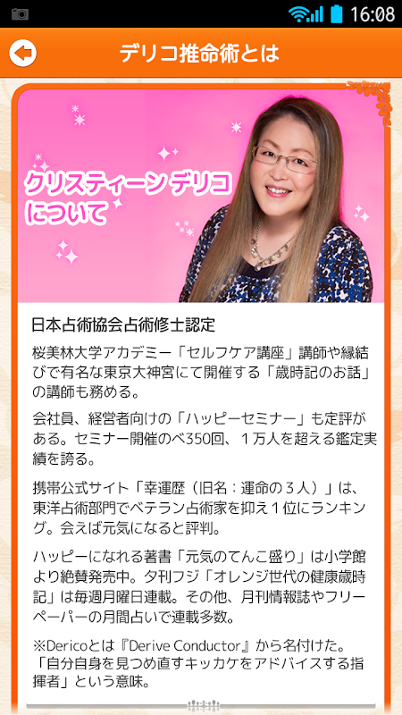 「元気が出る占い師」のキャッチフレーズで、携帯・PC公式サイト、テレビ、ラジオや雑誌の占いコーナー、様々なハッピーセミナーで活躍中のクリスティーン デリコの占い『デリコ推命術』が、スマホアプリに登場!