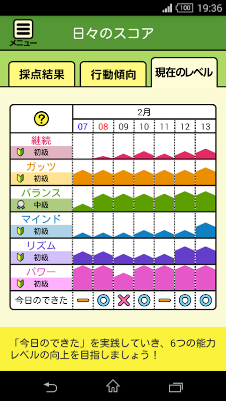 毎日の課題「今日のできた」をクリアしていくことで、「日々のスコア」が変化。採点結果から自分の行動傾向、能力レベルを確認できます。