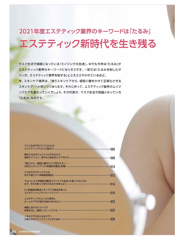 「ヌーヴェル エステティック スパ日本版」は技術分野をメインに、内外の最新美容情報、最新技術、新商品の話題など、美容、健康についての情報が満戟。そのキャリアと内容の確かさで、エステティシャン、サロンオーナーなどのエステ業界・美容業界はもちろん、健康産業に従事されている方や一般の方まで、幅広く愛読されています。