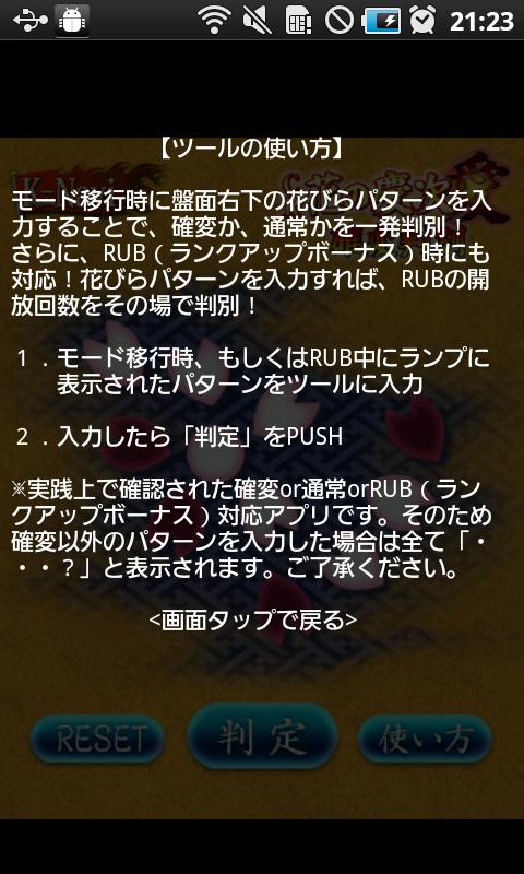モード移行時に盤面右下の花びらパターンを入力し、確変か、通常かを一発判別しましょう!またRUB(ランクアップボーナス)の開放回数判別にも対応!花びらパターンを入力すれば、RUBの開放回数をその場で判別できます!
