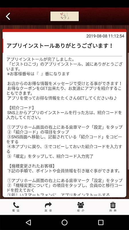 ビストロこづのアプリをSNSを通じてお友達に紹介する事ができます。