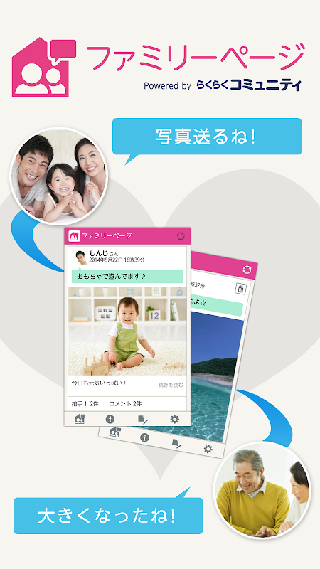 家族で写真・メッセージをかんたんに共有!拍手!やコメントで楽しく交流できます。