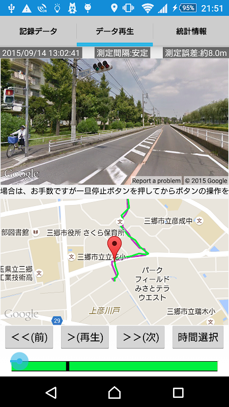 ・ 散歩やお出かけ時の様子を後でストリートビューで追体験、統計データで移動距離や速度の確認など。