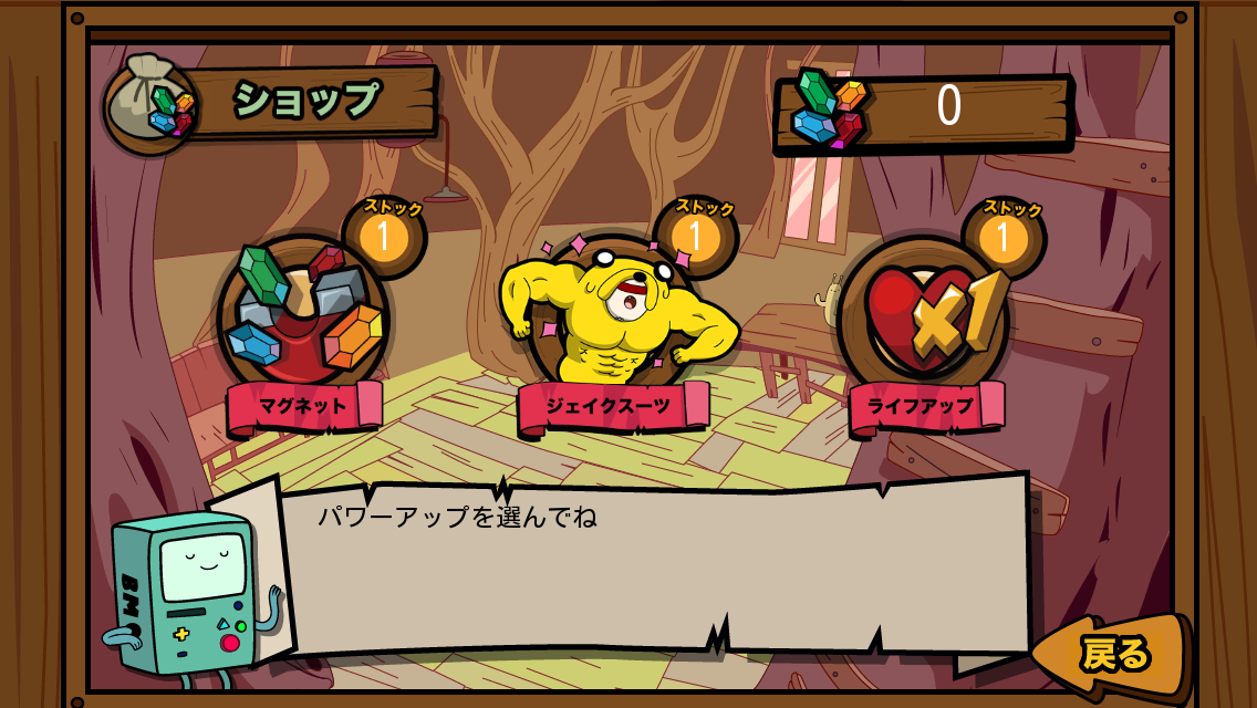 ステージ内に散らばっている宝石を集めて、ツリーハウスのショップでパワーアップアイテムをGETしよう!パワーアップアイテムは3種類。うまく使って冒険に役立ててね!