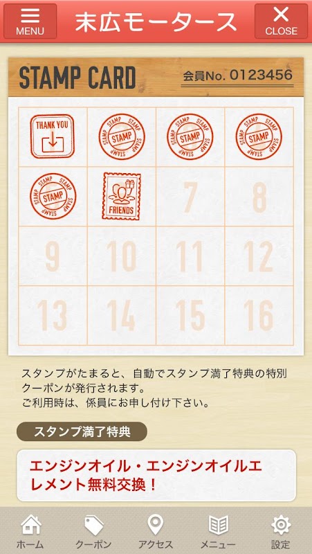 来店時に発行するスタンプをためると、お得な特典サービスも多数あり!