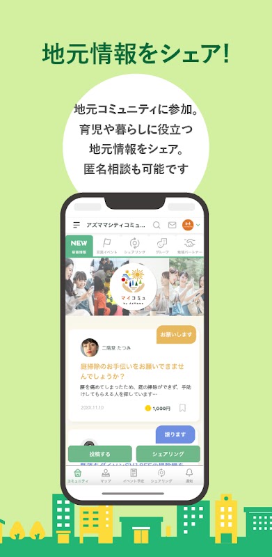 一個社區應用程序,允許居民在生活和撫養孩子方面互相幫助。它可以用於以地方政府和企業為主導合作夥伴的互助社區創建領域。