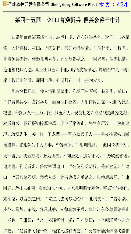 本应用是一款展示《三国演义》全文的书籍应用。全书共有1126个页码,将《三国演义》全文一百二十回精彩的呈现在本应用中。书中插入了大量与《三国演义》相关的图片,将《三国演义》的部分内容以图画的形式展现给读者。本书制作画面精美,让读者在阅读本书的同时,也得到了艺术的享受。