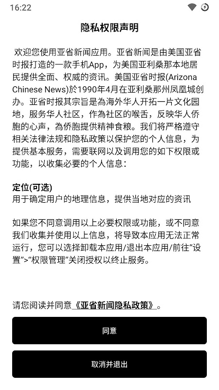 歡迎您使用亞省新聞應用。亞省新聞是由美國亞省時報打造的一款手機App,為美國亞利桑那本地居民提供全面、權威的資訊。美國亞省時報(Arizona Chinese News)於1990年4月在亞利桑那州鳳凰城創辦。亞省時報其宗旨是為海外華人開拓一片文化園地,服務華人社區,作為社區的喉舌,反映華人僑胞的心聲,為僑胞提供精神食糧。