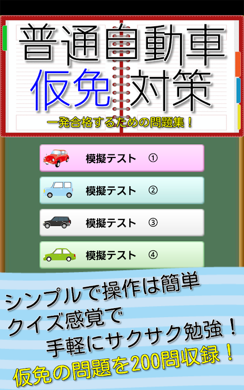 普通自動車運転免許の取得に必須となる『仮免許』の学科試験に一発合格するための問題集アプリです。