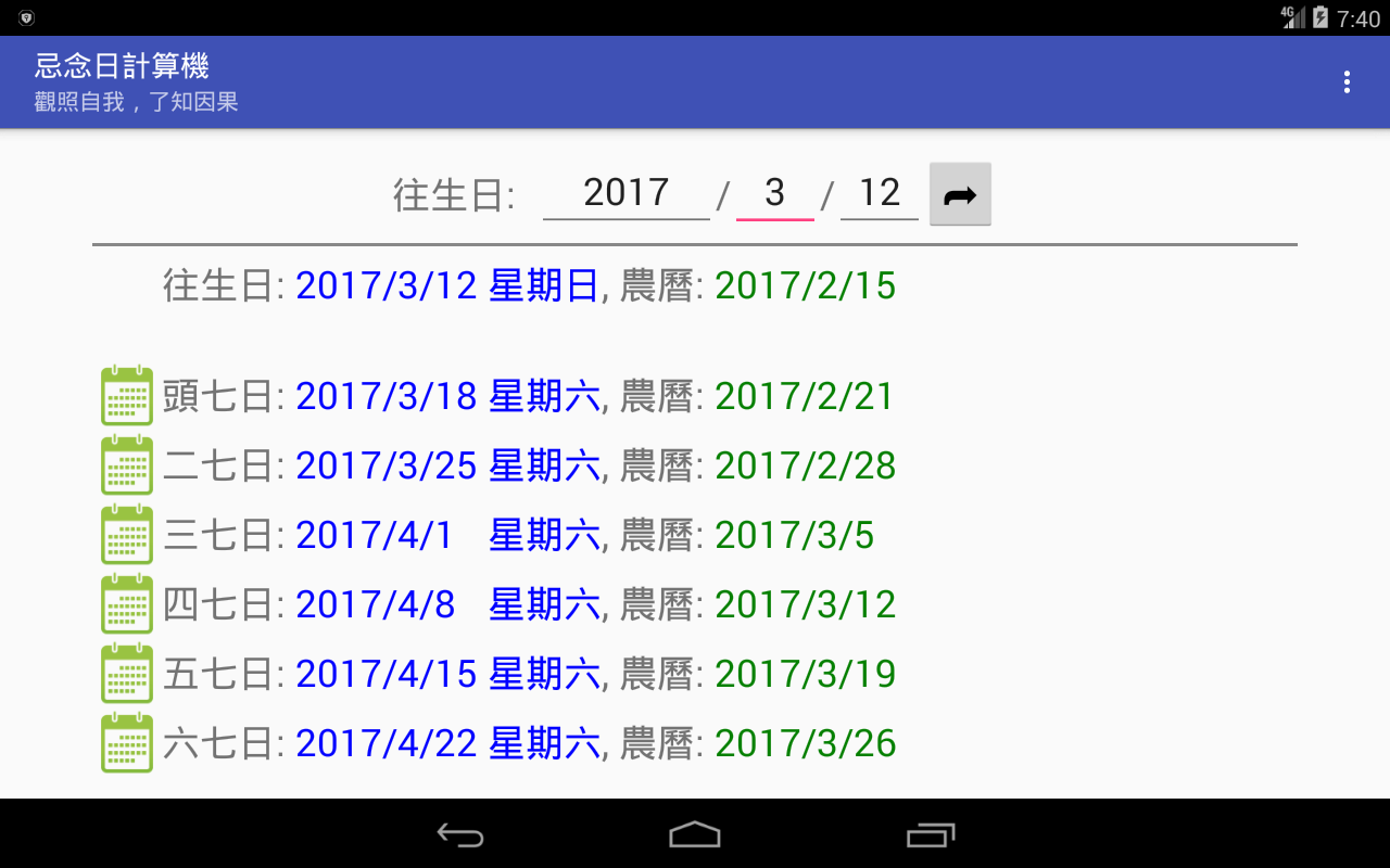在中國傳統治喪習俗中,人往生後在每一個七天都要為亡者做功德,冀望以此功德能令亡者往生善道,除此之外亦有百日、對年與三年這些祭拜日,這些日期是以中國傳統農曆來計算日期,現代人沒有農曆的概念,難以計算這些日期,作七百日對年日期計算機便是針對這些日期所生的計算機,只要輸入亡者的往生日期,就可以推算出所有的忌念日。