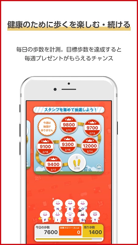 お持ちのスマートフォンとウェアラブル端末から歩数データを取得し、自動設定される目標歩数に対して、ご自身の達成状況を分かりやすく表示します。そして、目標歩数を達成するごとに、スタンプがもらえ、貯めたスタンプをコンビニで使える無料クーポンの抽選に毎週参加できます。