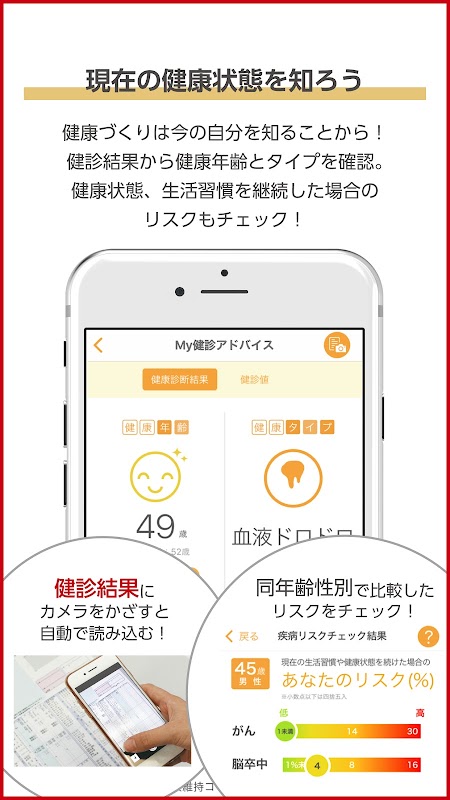 健康診断書にスマホのカメラをかざすだけで、自動的にデータを取得。健康年齢と健康タイプがわかります。