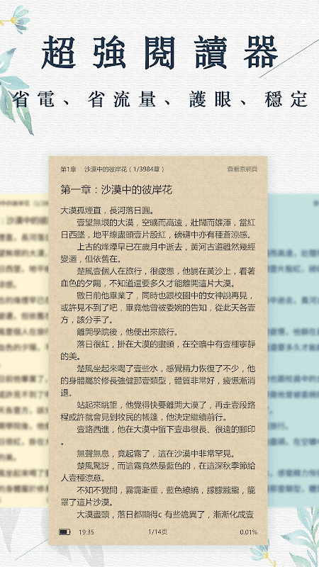 1、強大的閱讀器,支持自定義背景和字號調節,
