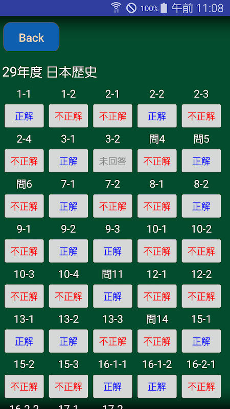 回答状態を”正解/不正解/未回答”でボタンを表示させており、進捗状況を一目で確認できます。