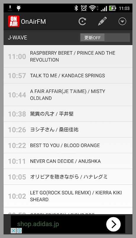 ・手動更新モード(更新OFF):更新ボタンを押すと最新のオンエア曲を表示します