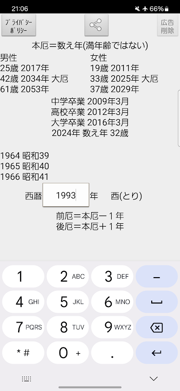 從西曆或日曆(昭和/平成)計算男性和女性的不幸年份(1981年出生的男性和1991年出生的女性是2023年,1982年出生的男性和1993年出生的女性是2025年)。