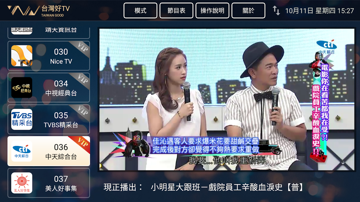 臺灣電視台、中天綜合、中天全民最大黨、中天美食旅遊、非凡美食、非凡旅遊、台視綜合、中視經典、中視菁采、靖天資訊、靖天戲劇、靖天綜合、靖天育樂、靖天日本、靖天國際、靖洋戲劇、靖天歡樂、原住民族電視、客家電視台、香港衛視、 VTV4、幸福TV、美人好事集