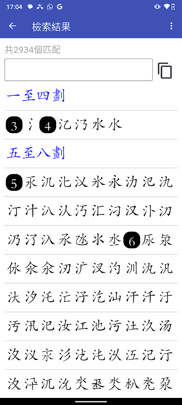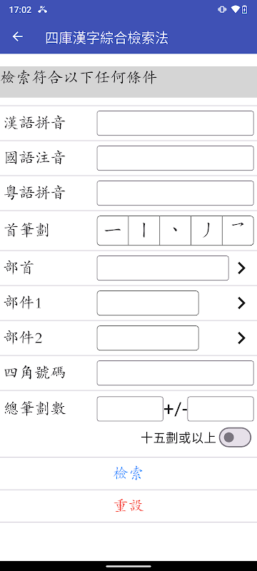 - 檢索方便,具備漢語拼音(直接輸入聲母、韻母及聲調)、粵語拼音、國語注音、首筆畫(分為「一」、「丨」、「丶」、「丿」、「乛」,只可選擇一項)、總筆畫數(可利用「+/-」擴大範圍來幫助檢索)、部首、部件(分為「上下」及「左右」兩種結構,用戶可按照所查詢文字的部件位置而選擇「上」、「下」、「左」、「右」,以收窄檢索的範圍)及四角號碼(依序取字的左上、右上、左下、右下角的筆劃,取得四位數字,再增加一位補碼,稱為「附角」,故只需輸入五個位的數字,便可查出相關文字)等多種輸入法。