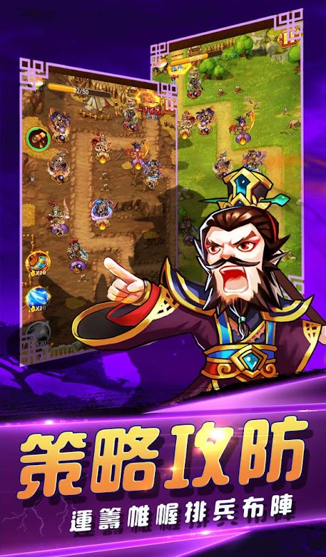 遊戲將塔防要素和角色養成要素完美結合在一起,武將可以通過升級的方式強化,升級可以強化武將攻、血、速等屬性,升級到一定程度就可以建築升級武將塔。因此如何分配手中資源達到戰力最大化,也是考驗玩家策略的要素之一。