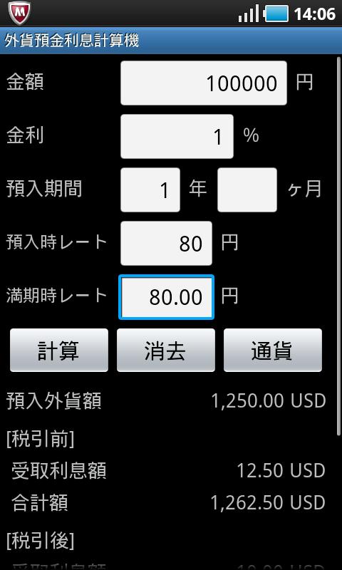 ・外貨預金利息計算機は、金額、金利、預入期間、預入時レート、満期時レートから、外貨預金の受取利息額を計算するアプリです。