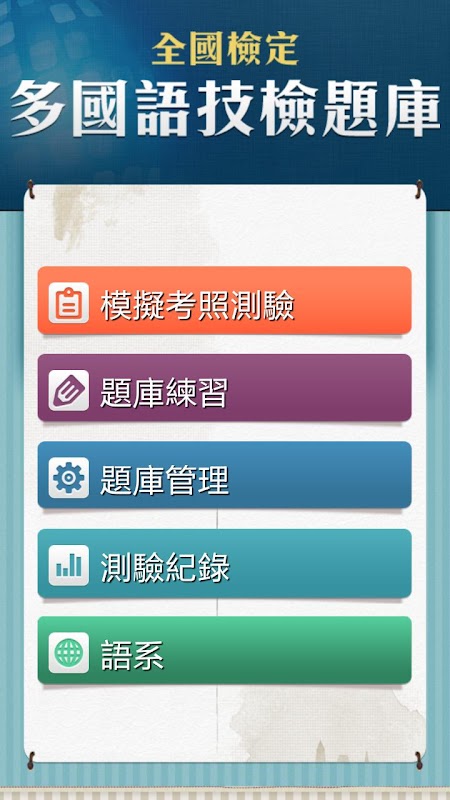1.本APP支援多國語言,包含有繁體中文、越南文、泰文、印尼文及英文等五種語系,可自訂語系進行檢定題庫模擬測驗與練習。