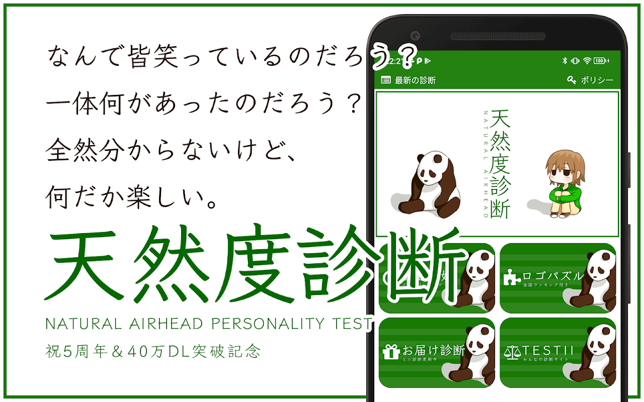 皆様に愛され、『天然度診断』は累計20万ダウンロードを突破いたしました。沢山のユーザー様に遊んでいただき、製作者一同、心より感謝申し上げます。まだお試しされていない方も、ぜひ一度、遊んでいただければ幸いです。
