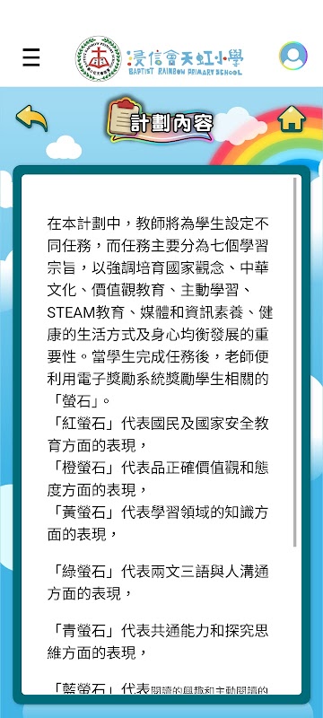 透過此獎勵計劃,教師將為學生設定不同任務,而任務主要分為七個學習宗旨,以強調培育國家觀念、中華文化、價值觀教育、主動學習、STEAM教育、媒體和資訊素養、健康的生活方式及身心均衡發展的重要性。當學生完成任務後,老師便利用電子獎勵系統獎勵學生相關的「螢石」。