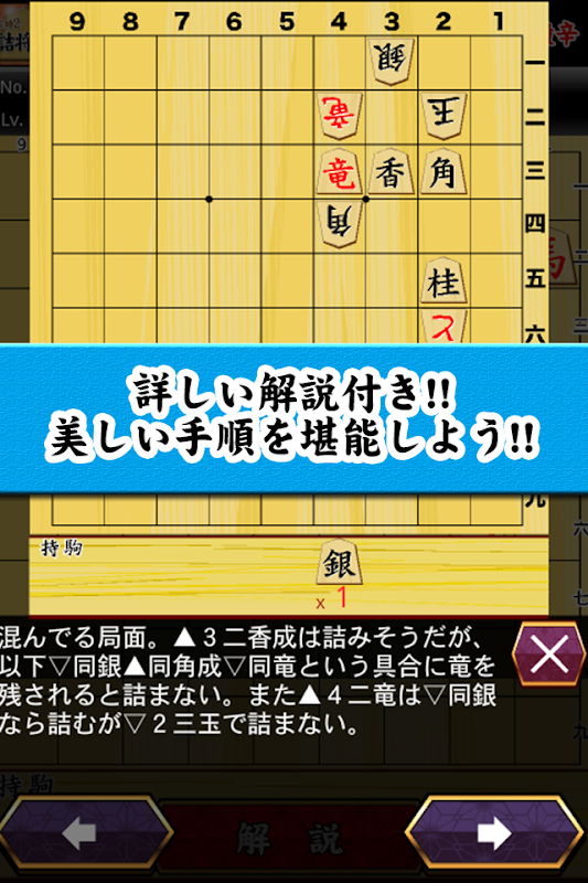 「詰将棋を解く」をタッチすると作品が表示されます。 攻方の駒をタッチすると選択状態になりますので、移動させたい箇所の盤上をやはりタッチします。 正解手ならば玉方が自動的に対応してくれます。不正解ならばその場で初手からやり直しになります。